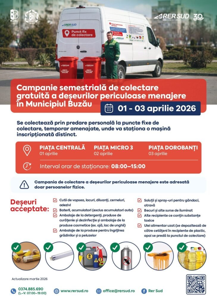 RER SUD, în calitate de unic operator de salubrizare de pe raza municipiului Buzău organizează împreună cu Primăria Buzău prima campanie din acest an dedicată colectării gratuite a deșeurilor voluminoase și periculoase menajere generate de populație.