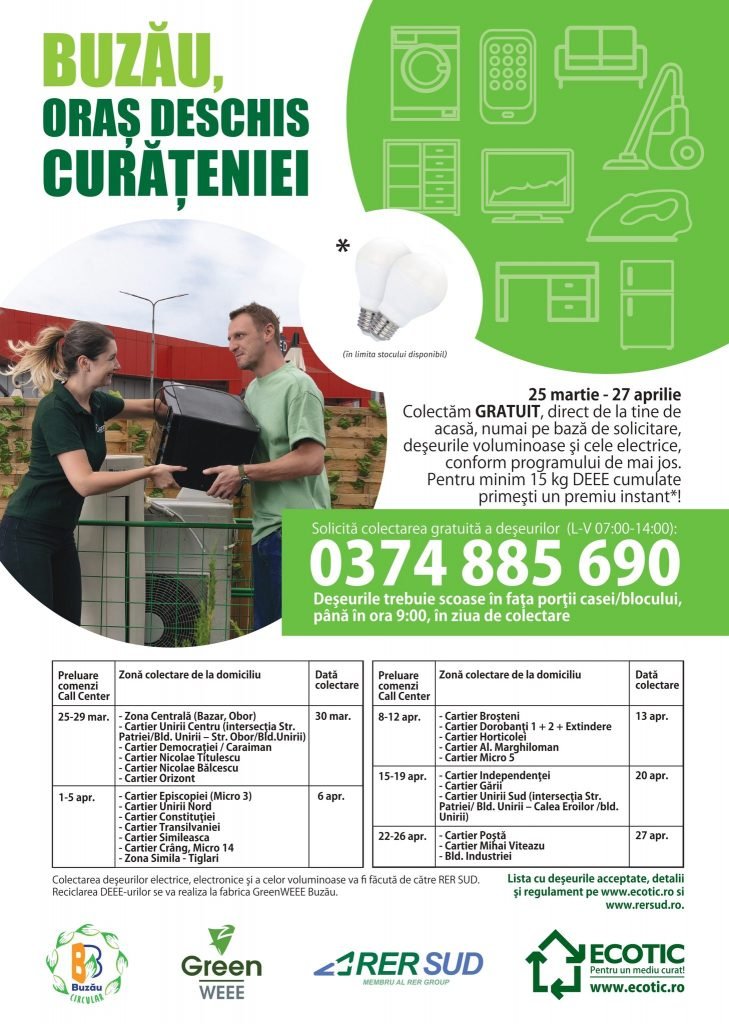 În cadrul campaniei buzoienii au posibilitatea de colectare a deșeurilor electrice și a celor voluminoase direct de la domiciliu, în baza unei solicitări. Comenzile se vor face la numărul 0374 885 690, de luni până vineri în intervalul orar 7:00-14:00, începând cu data de 25 martie. În urma programării colectării, deșeurile vor trebui scoase în fața porții casei/blocului până în ora 9:00, în ziua de colectare aferentă fiecărei zone.