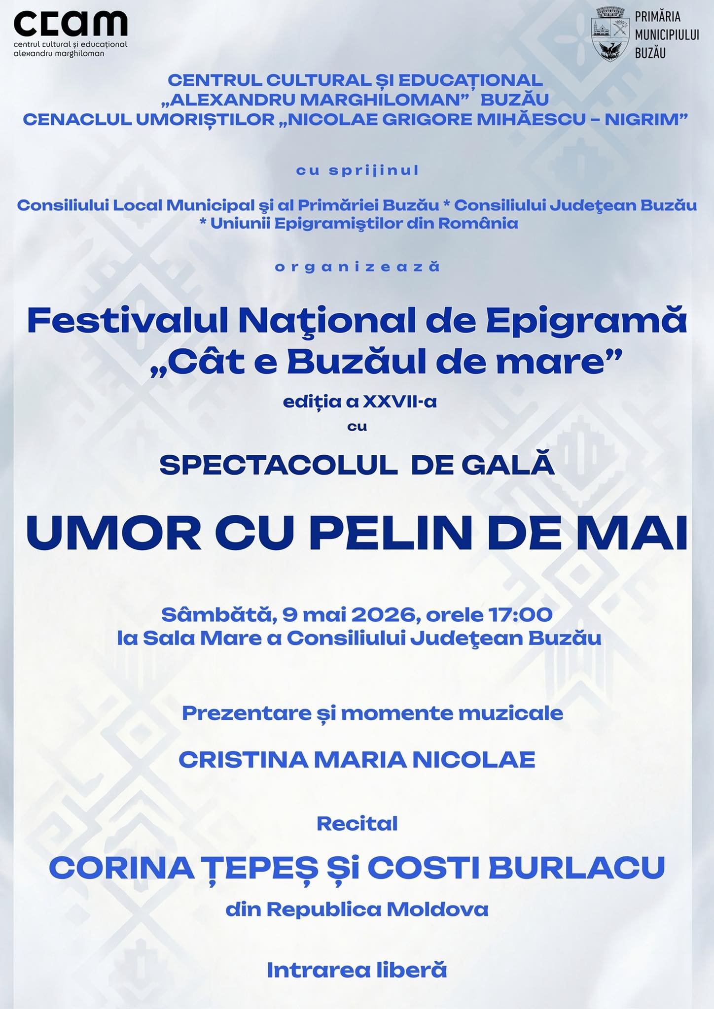 Centrul Cultural și Educațional „Alexandru Marghiloman” şi Cenaclul umoriștilor „Nicolae Grigore Mihăescu – Nigrim”, organizazorii, Festivalului Național de Epigramă „𝐂𝐚̂𝐭 𝐞 𝐁𝐮𝐳𝐚̆𝐮𝐥 𝐝𝐞 𝐦𝐚𝐫𝐞”, invită publicul buzoian la 𝐒𝐩𝐞𝐜𝐭𝐚𝐜𝐨𝐥𝐮𝐥 𝐝𝐞 𝐠𝐚𝐥𝐚̆ ce va avea loc 𝐬𝐚̂𝐦𝐛𝐚̆𝐭𝐚̆, 𝟗 𝐦𝐚𝐢, 𝐨𝐫𝐚 𝟏𝟕:𝟎𝟎, la 𝐒𝐚𝐥𝐚 𝐌𝐚𝐫𝐞 𝐚 𝐂𝐨𝐧𝐬𝐢𝐥𝐢𝐮𝐥𝐮𝐢 𝐉𝐮𝐝𝐞𝐭̦𝐞𝐚𝐧, intrarea fiind liberă.