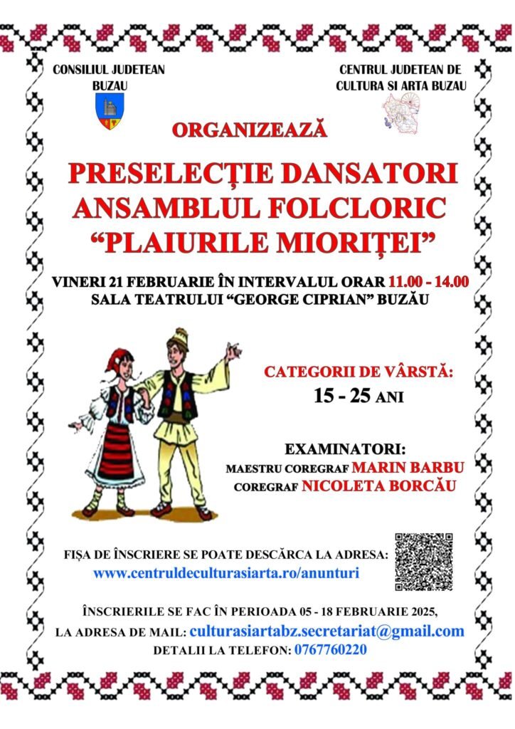 Vineri 21 februarie în intervalul orar 11:00 – 14:00, la Sala Teatrului “George Ciprian” Buzău, se organizează preselecția de către domnul Maestru coregraf Marin Barbu (Nea Mărin).