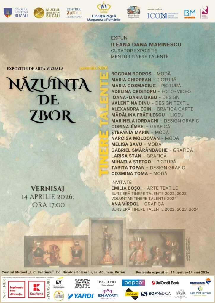 Muzeul Județean Buzău, instituție de cultură și cercetare aflată sub autoritatea Consiliului Județean Buzău, în parteneriat cu Fundația Regală Margareta a României, anunță vernisajul expoziției „Năzuința de zbor”, dedicată tinerilor artiști ai generației 2026. Evenimentul reunește lucrări realizate de beneficiarii programului de burse Tinere Talente al Fundației Regale Margareta a României și evidențiază diversitatea expresiei artistice contemporane, precum și angajamentul noii generații față de valorile culturale universale.
