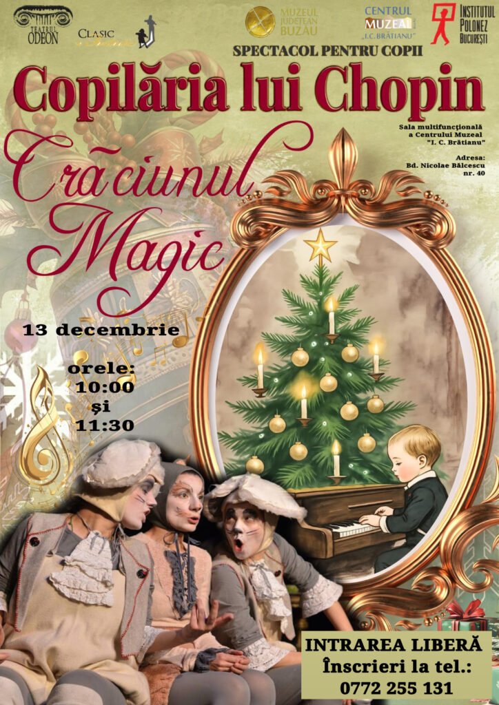 Institutul Polonez / Instytut Polski w Bukareszcie din București, în parteneriat cu Muzeul Județean Buzău, are plăcerea de a invita publicul din Buzău la două reprezentații speciale ale spectacolului ”Copilăria lui Chopin, Magia Crăciunului”, dedicate atmosferei sărbătorilor de iarnă.