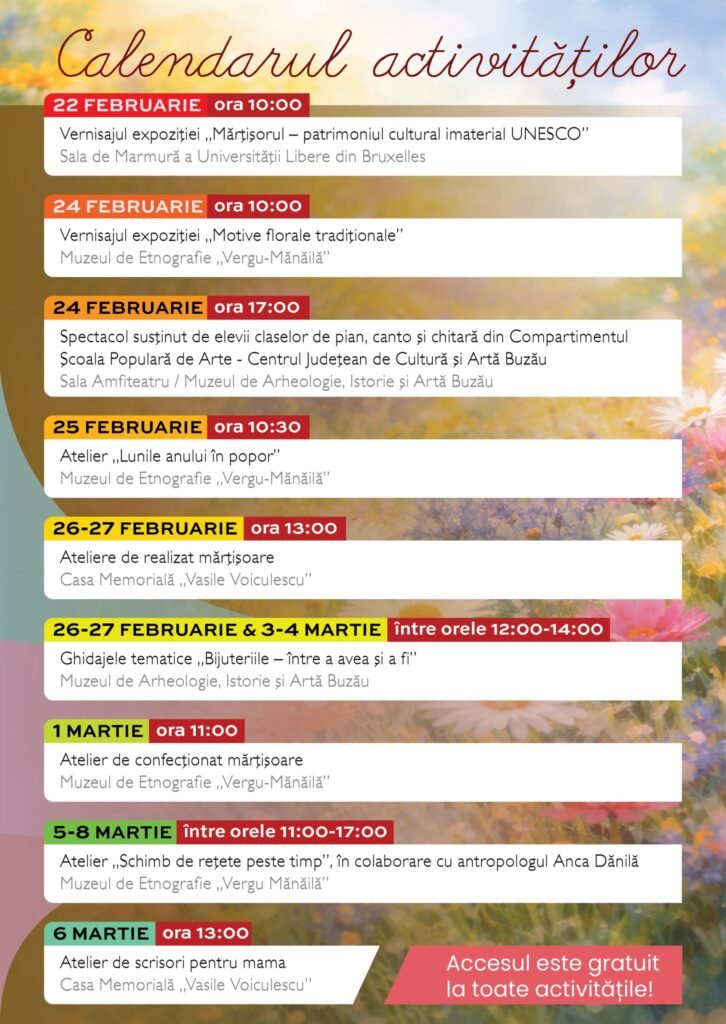 Atelier meșteșugăresc de confecționat mărțișoare organizat la Muzeul de Etnografie „Vergu-Mănăilă”, în ziua de 1 martie 2026, începând cu ora 11.00. Atelierul este realizat în parteneriat cu Asociația Meșterilor Populari și Artiștilor Buzău, iar accesul este gratuit, în limita locurilor disponibile, fiind necesară programare prealabilă la numărul de telefon 0772 255 131.