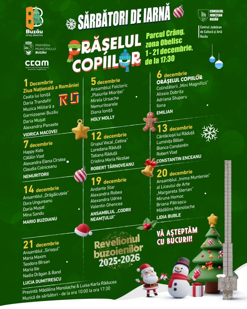 𝗖𝗲 𝗽𝗿𝗲𝗴𝗮̆𝘁𝗶𝗺: concerte cu artiști buzoieni și artiști naționali de renume, coruri de copii și ansambluri, căsuțe pline de cadouri și produse tradiționale, delicii culinare și băuturi calde.