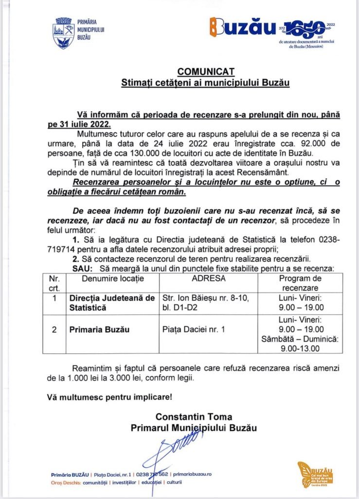 Vă mulțumesc celor 9.000 de buzoieni care s-au recenzat de la ultimul apel făcut și vă rog și pe cei care nu v-ați înregistrat să vă grăbiți!